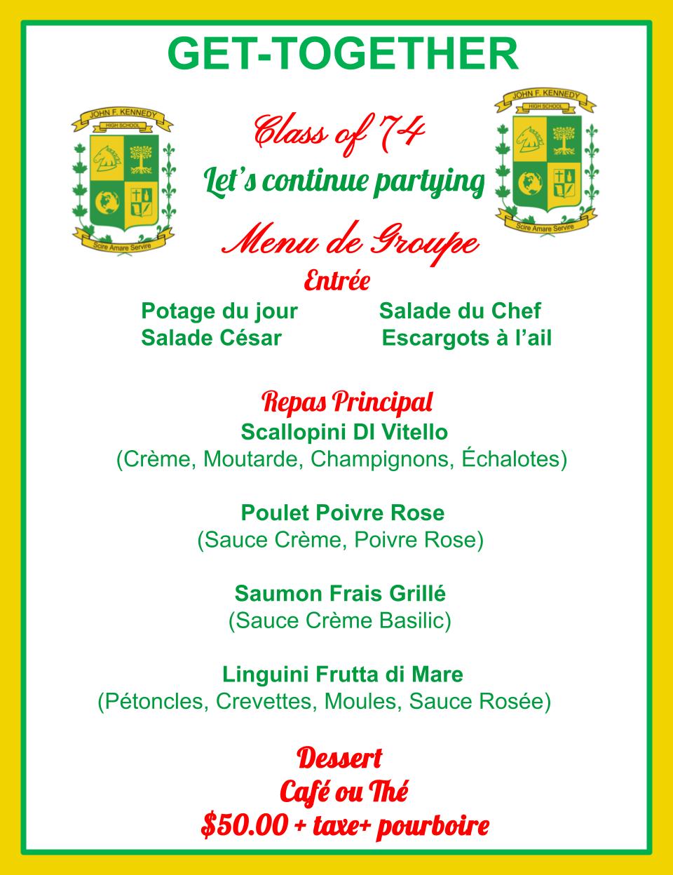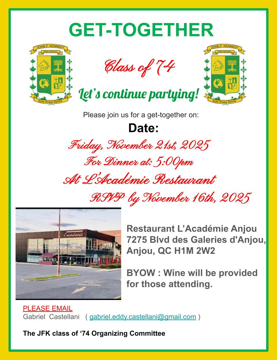 Subject: JFK class of 1974 in Montreal, 50-year reunion, Nov. 2, 2024, held at Le Classique.